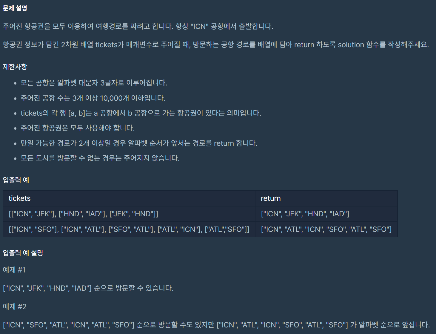 - Arrays.sort와 hashmap을 활용하여 순서를 정렬한 뒤, 해당 순서로 출발 공항, 도착 공항을 정리한 표를 생성한다.