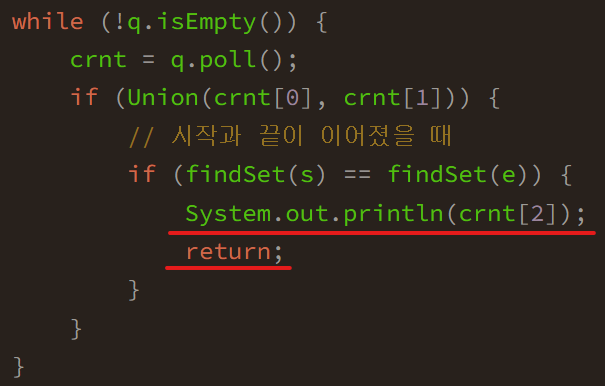 if (findSet(s) == findSet(e)) {