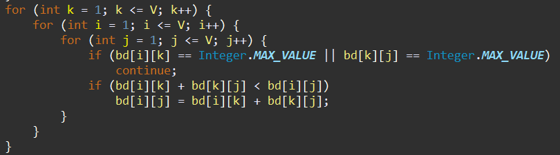 if (bd[i][k] == Integer.MAX_VALUE || bd[k][j] == Integer.MAX_VALUE)