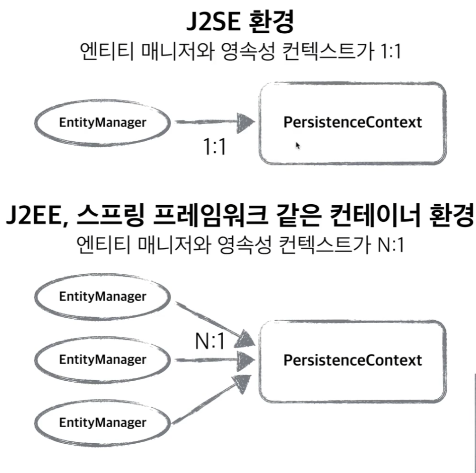 엔티티 매니저와 영속성 컨텍스트가 1:1, 1:N